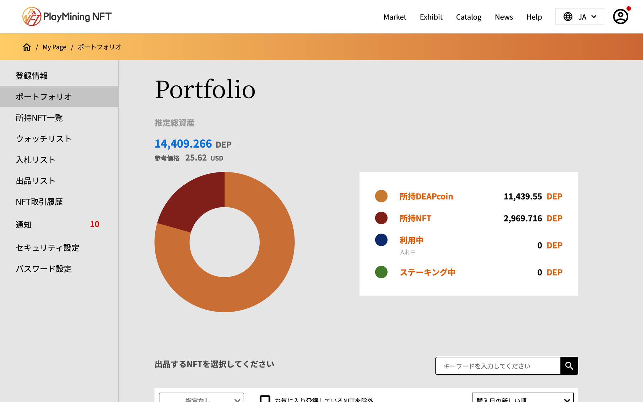 から、保有またはステーキング中のDEAPcoinや所持NFTの資産総額を確認できます。