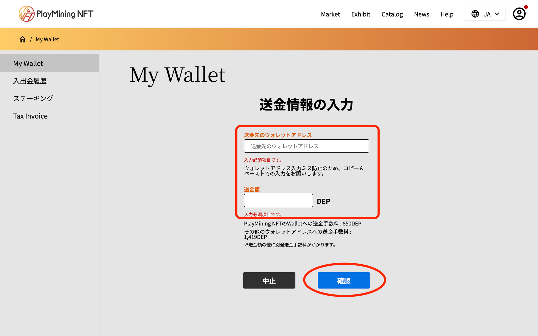 ※送金先ウォレットアドレスを誤ると資産が消えてしまう可能性がありますので十分にご注意ください。また、PlayMiningでは送金ミスに伴う、一切の責任を負いません。