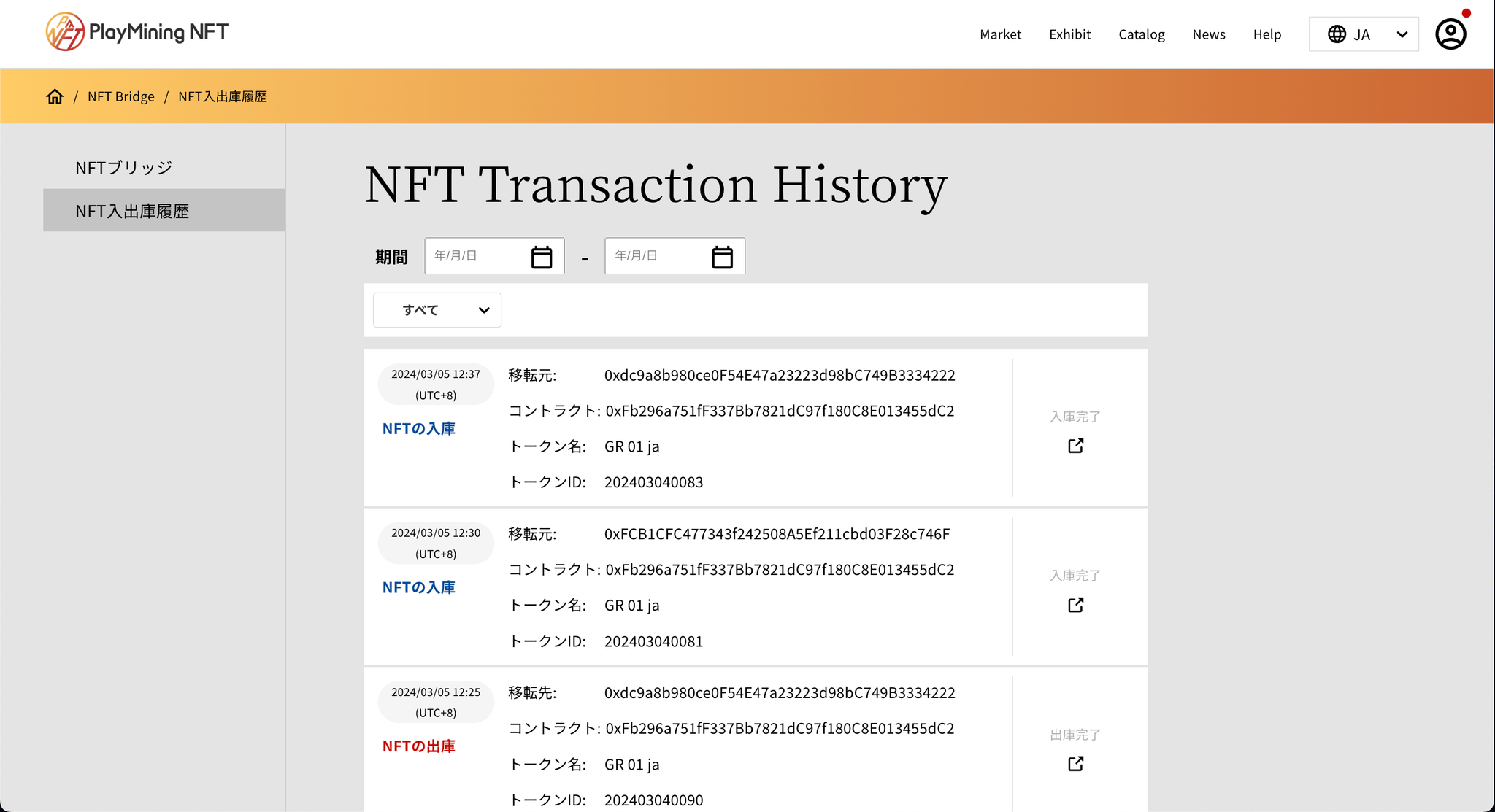 NFT入出庫履歴にて、ブリッジ機能によりNFTの入庫もしくは出庫のリクエストを行った際の進捗状況をご確認いただけます。